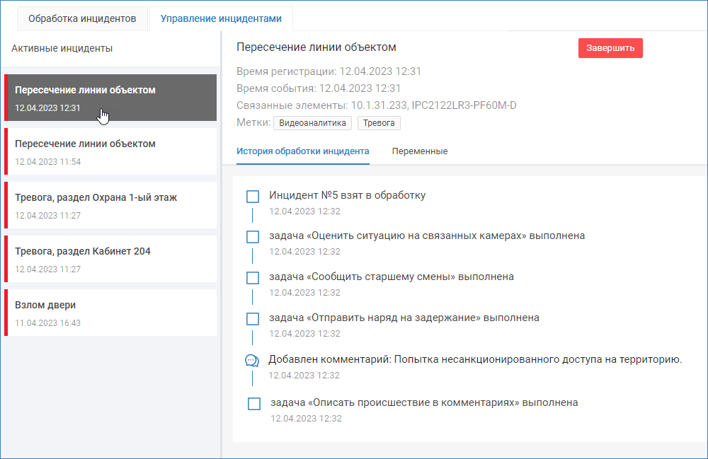 С версии 20,8 Платформы НЕЙРОСС у администратора системы появился инструмент просмотра инцидентов, находящихся в обработке у операторов мониторингового центра, ознакомление с историей обработки инцидента и принудительное их завершение. Также вы можете построить отчёт по инциденту, по смене оператора и журнал инцидентов [Шаблоны НЕЙРОСС Центр].