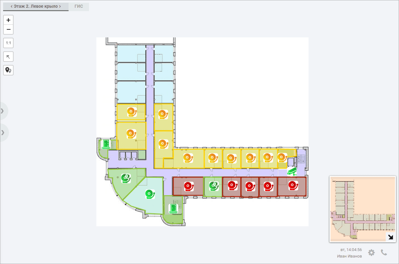 Окно содержит три панели: лента событий, дерево планов/элементов, окно плана/карты. При выборе события в ленте панель с деревом планов/элементов скрывается под карточкой события [Обработка событий].