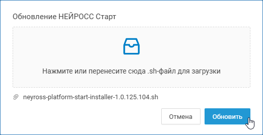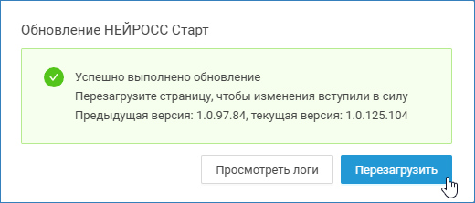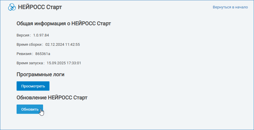 Обновление версии НЕЙРОСС Старт может выполняться путём повторной повторной установки приложения [Установка НЕЙРОСС Старт], а также посредством НЕЙРОСС Старт. В данном разделе приведён порядок обновления НЕЙРОСС Старт посредством веб-интерфейса.