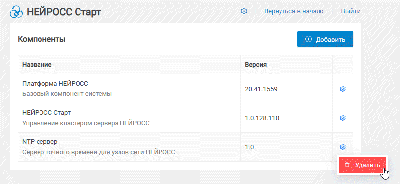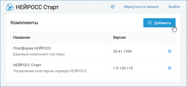 Компоненты кластера приложений Платформы НЕЙРОСС обеспечивают расширение функционала Платформы НЕЙРОСС. НЕЙРОСС Старт обеспечивает веб-интерфейс установки, обновления и удаления компонентами.