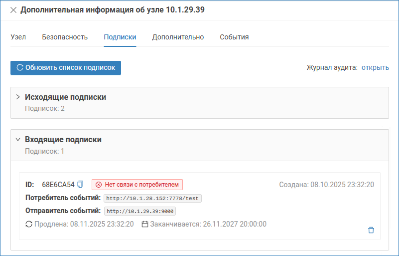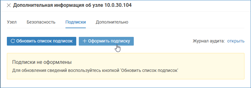 Управление подписками осуществляется на вкладке Подписки окна дополнительной информации об узле.