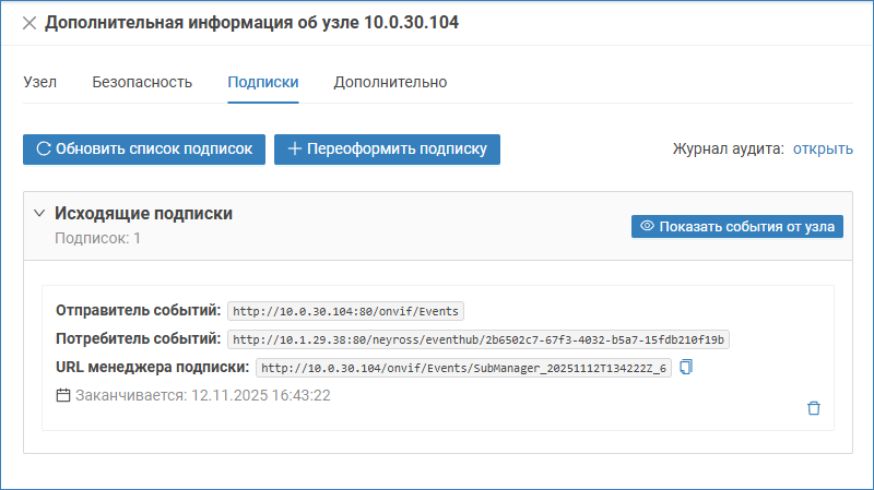 Для получения событий от ONVIF-узлов (IP-камер или кодеров), в том числе событий видеоаналитики, Платформа НЕЙРОСС/ДеВизор оформляет входящую подписку на получение событий. Эта подписка создается на ограниченное время и периодически продлевается. Текущий статус медиаисточника отображается в разделе Сеть. При ошибках оформления или продления подписки, отображается иконка . Ошибка обновления или продления подписки может формироваться в случае: Подписка на ONVIF-медиаисточник оформляется автоматически. При необходимости переоформления вы можете: Также, если на узле Платформа НЕЙРОСС/ДеВизор настроено несколько сетевых интерфейсов или один интерфейс настроен на работу в нескольких подсетях, а медиаисточник находится за роутером (во внешнем контуре относительно узла Платформа НЕЙРОСС / ДеВизор), возможна ситуация, когда по каким-то причинам был неверно рассчитан требуемый IP-адрес, и подписка оформилась на неверный. В этом случае события не будут поступать, но ошибок оформления подписок не будет. Интерфейс управления подписками позволяет отслеживать поступление событий от ONVIF-узла в режиме реального времени, удалить «неправильную» подписку и оформить подписку с указанием IP-адреса из одной подсети с медиаисточником. Узлы Платформа НЕЙРОСС / ДеВизор могут выступать в качестве ONVIF-узлов и обеспечивают возможность оформления входящей подписки от «внешнего» потребителя ONVIF-событий — «внешней системы», оформляющей подписку на события узла НЕЙРОСС и обеспечивающий приём таких событий. В этом случае для узла Платформа НЕЙРОСС / ДеВизор в разделе Подписки будет отображаться входящая подписка.