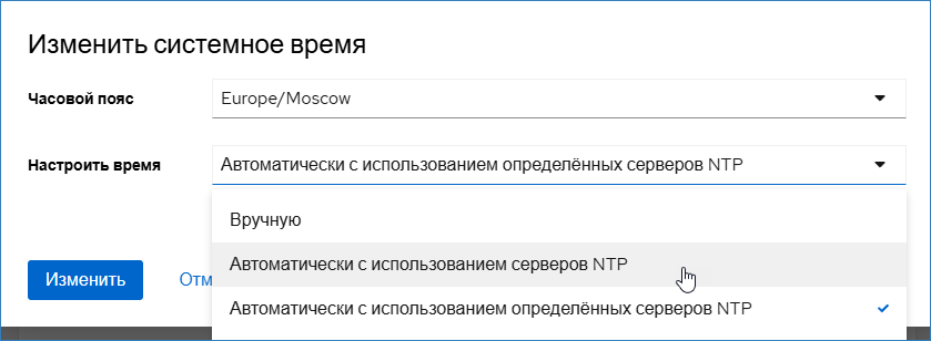 - Автоматически с использованием серверов NTP при наличии доступа в сеть Интернет и необходимости синхронизации с общедоступными серверами времени.