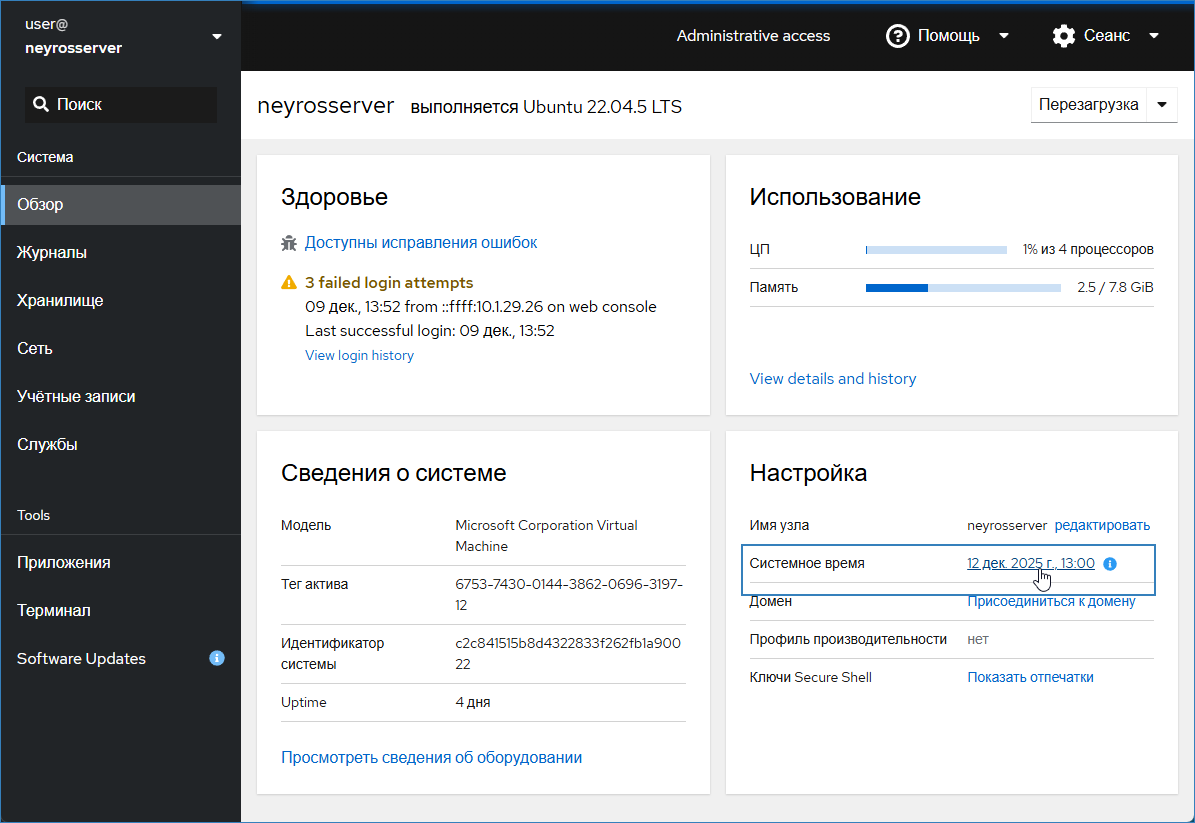В разделе Обзор в блоке Настройка в поле Системное время щелкните левой клавишей мыши по текущему значению, чтобы изменить параметры.