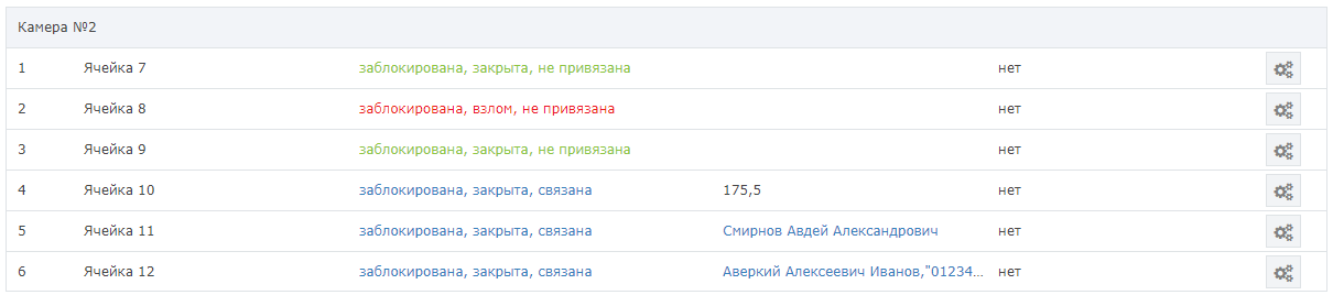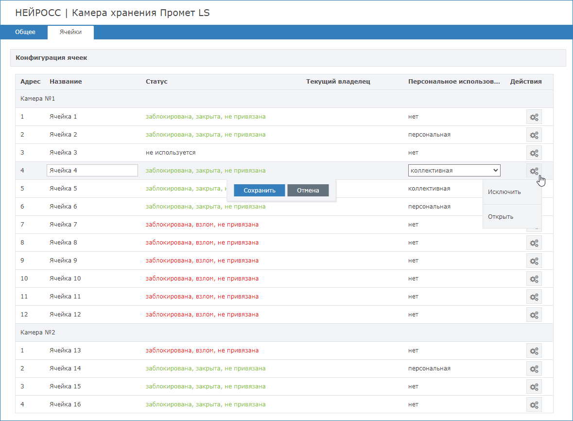 Назначение персонального использования ячеек, а также мониторинг состояний и управление ячейками осуществляется с помощью плагина БОРЕЙ, управляющего конкретной камерой хранения, на вкладке Ячейки.