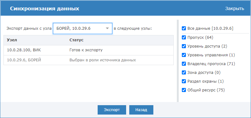 Выберите в качестве источника узел БОРЕЙ, нажмите на кнопку Экспорт.