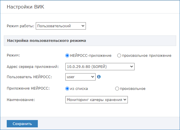 | Пользователь НЕЙРОСС | Список учётных записей НЕЙРОСС | Выберите из раскрывающегося списка учётную запись с правом на приложение «Мониторинг камеры хранения», созданную на этапе [Настройка пользователя приложения «Мониторинг камеры хранения»]. |