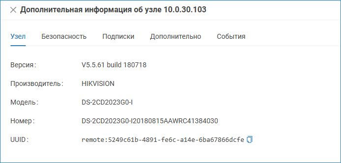 - Общие сведения об узле — наименование, модель, версия и прочие данные— вкладка Узел;