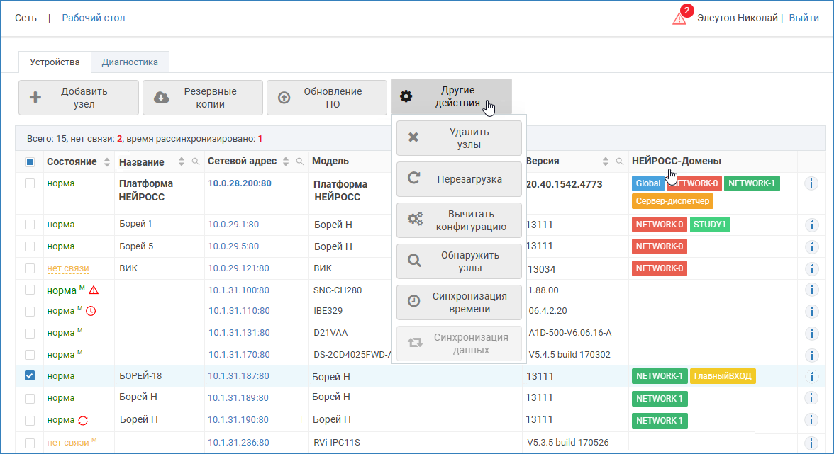 Приложение Сеть предназначено для добавления узлов НЕЙРОСС и ONVIF IP-камер, проверки состояния связи, синхронизации времени и данных, вычитывания конфигурации и группового управления узлами НЕЙРОСС (обновление прошивки, перезапуск и создание резервных копий).