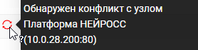 | Рассинхронизация данных (конфликт ресурсов) | Отсутствие расхождений (конфликтов) ресурсов всех узлов сети НЕЙРОСС является условием работоспособности системы. При условии первичной синхронизации и при постоянном наличии сетевого соединения синхронизация ресурсов обеспечивается узлами самостоятельно. При условии длительных потерь связи возможно возникновение конфликта ресурсов [Рассинхронизация данных, конфликт ресурсов. Что делать?]. Запуск процедуры проверки на наличие конфликтов осуществляется при входе в раздел Сеть и каждый раз при обновлении страницы. При этом требуется проверить каждую пару узлов по каждому типу данных. Это длительная и ресурсоёмкая задача, проверка может занять длительное время (до нескольких минут). По факту выявления конфликта отображается иконка. Имя и IP-адрес узла, с которым выявлен конфликт, можно просмотреть при наведении указателя мыши на иконку. Состояние связи: есть сетевое соединение, интервал расхождения времени с текущим узлом НЕЙРОСС – менее 5 секунд, нет конфликта данных. | |