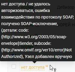 | Нет доступа | Нет авторизации по ONVIF, параметры авторизации не заданы или неверные. При наведении указателя мыши отображается подробная информация. Нажмите на кнопку Дополнительно в строке медиаисточника, введите корректные данные авторизации, проверьте время последнего Heartbeart-уведомления и время последней проверки связи по ONVIF [Обнаружение узлов]. | |