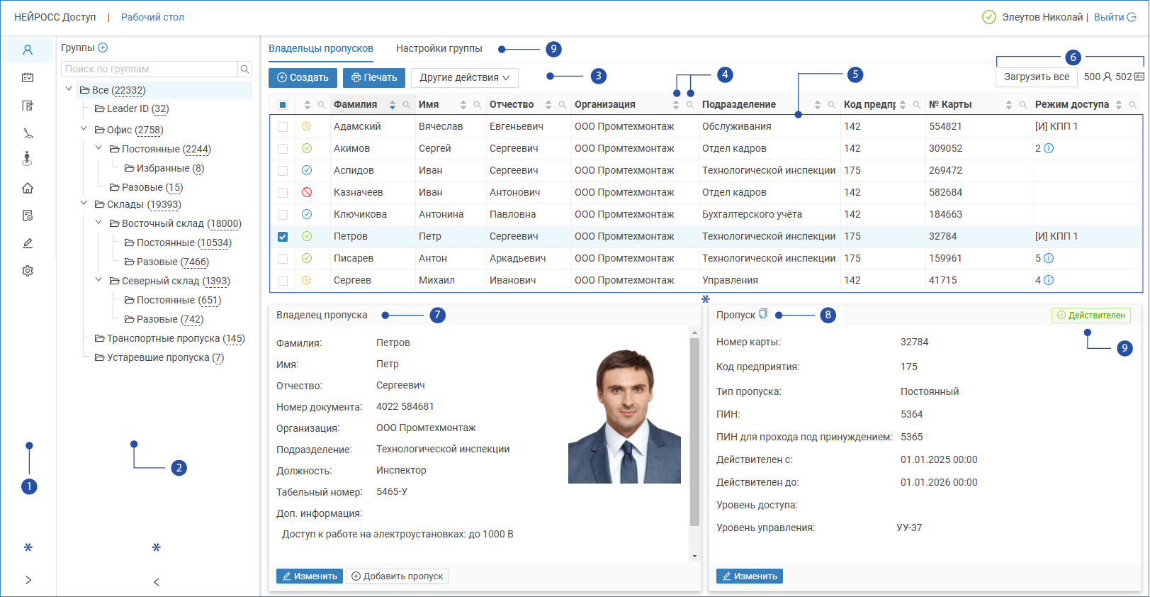 Для отображения всех владельцев и пропусков в группе и дочерних группах, нажмите на кнопку Загрузить все [6].