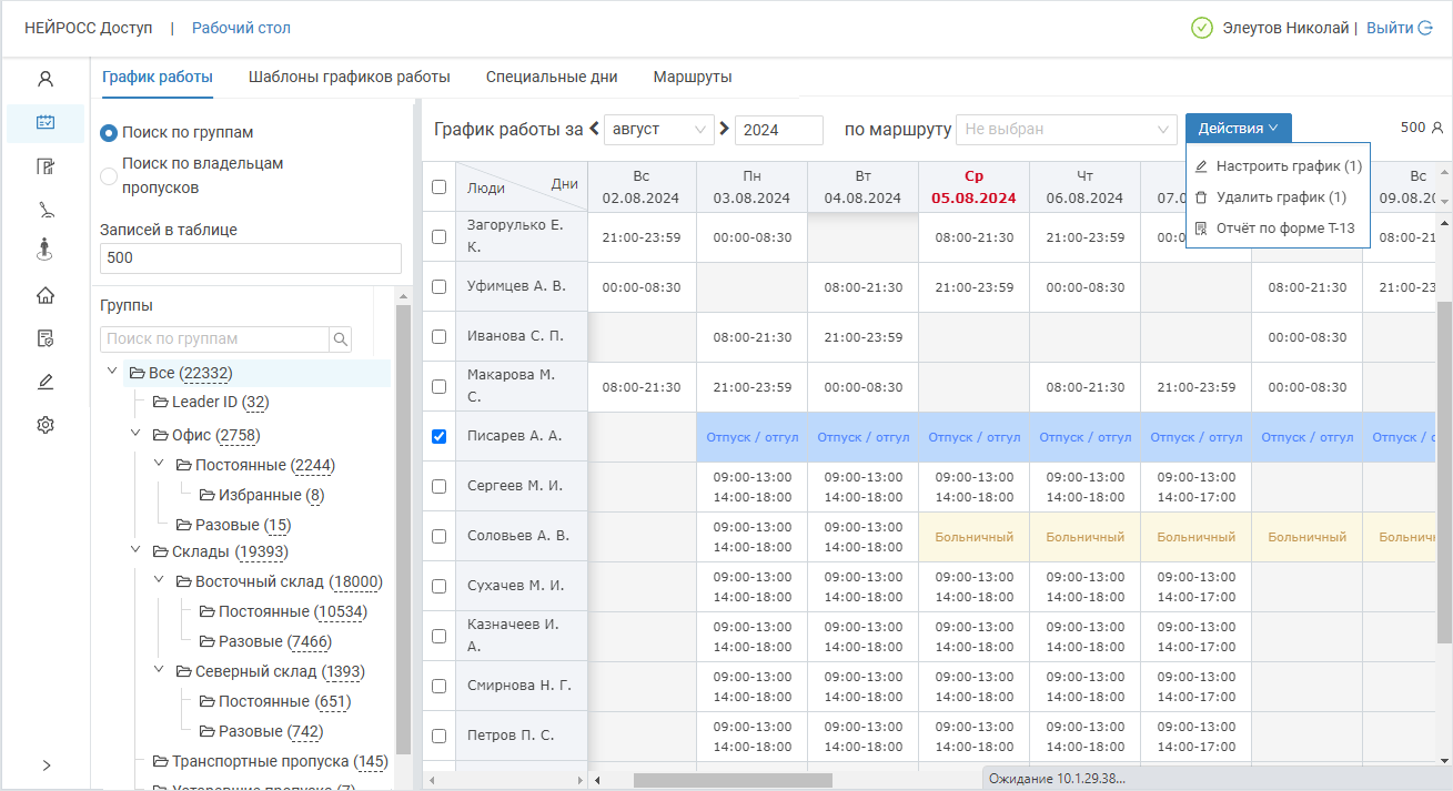 Функционал управления графиками работы лицензируется. При отсутствии необходимости контроля доступа и трудовой дисциплины по графику, используйте уровни доступа. Они позволяют задать временные интервалы и список точек доступа для каждого сотрудника индивидуально по каждому дню стандартной пятидневной рабочей недели. При сменном режиме работы и необходимости отказа в доступе в выходные дни, дни нетрудоспособности и отпуска, а также для учёта рабочего времени рекомендуем приобрести лицензию [Лицензирование | Платформа НЕЙРОСС].