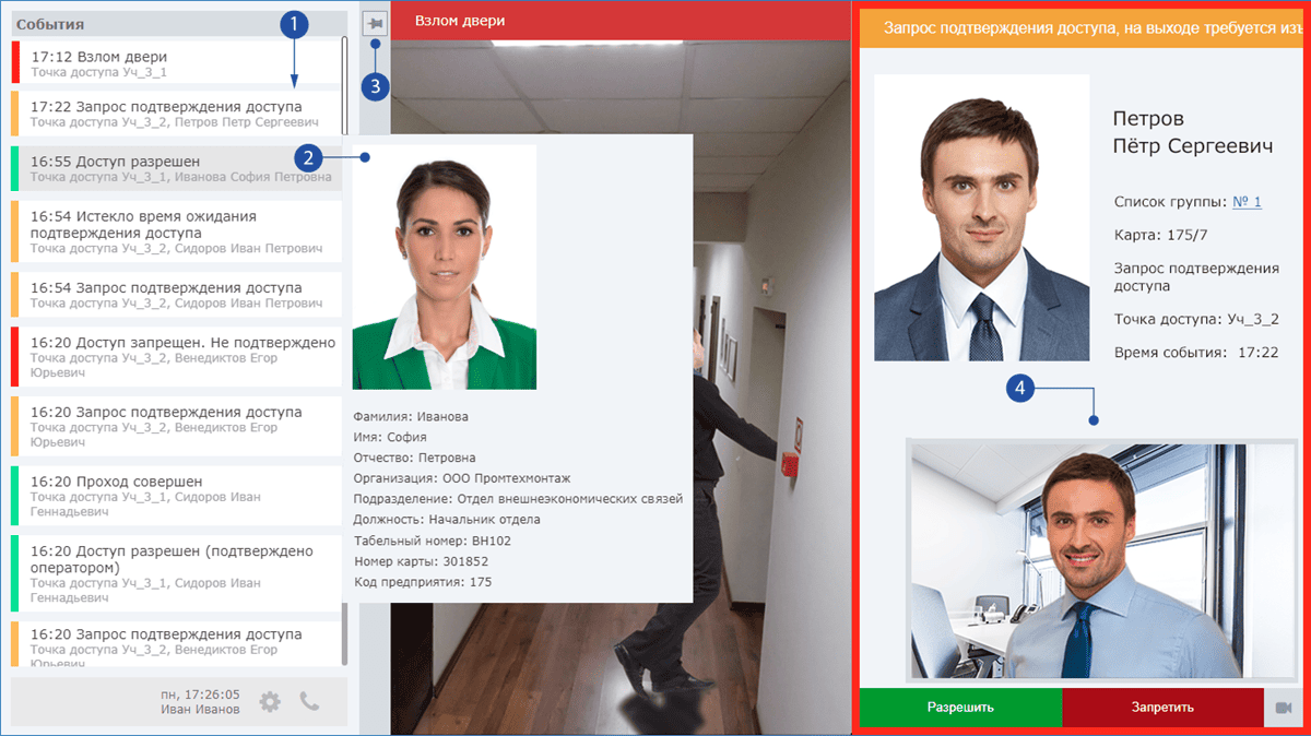 - Окно подтверждения доступа: информация по владельцу пропуска, кнопки разрешения/запрета доступа, окно «живого» видео.