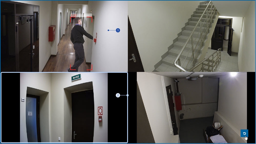 По получении тревожного сообщения Платформа НЕЙРОСС отображает в окне тревожного мультиэкрана «живое» видео от «связанных» медиаисточников. Фильтр событий и связь камер с источниками тревог настраивается администратором системы. В зависимости от числа «связанных» камер, автоматически выбирается оптимальная раскладка мультиэкрана от 1 до 8 ячеек. Показ видеопотока продолжается до получения нового извещения о тревожном событии, но не менее 5 секунд.