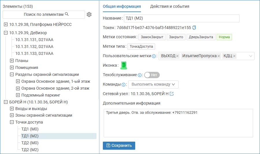 С версии 20.38 Платформы НЕЙРОСС по каждому элементу в добавлена информация о сетевом узле НЕЙРОСС, которому «принадлежит» элемент [Свойства элементов]. Такая информация особенно требуется для «поиска» зон охранной сигнализации, уже добавленных в разделы, так как при добавлении зоны в раздел элемент зоны «перемещается» из папки Зоны сигнализации контроллера в папку Разделы сигнализации узла Платформа НЕЙРОСС. Кроме того зоны, входящие в разделы, могут являться входами различных контроллеров.