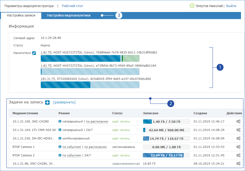 Для выполнения задач записи видеоархива, импорта данных с других узлов НЕЙРОСС и экспорта видеоматериалов для загрузки на компьютер, необходимо выделить место на дисках для хранения материалов каждого вида. В пределах выделенных областей ведется циклическая запись данных — по окончании свободного места производится удаление более «старых» материалов.