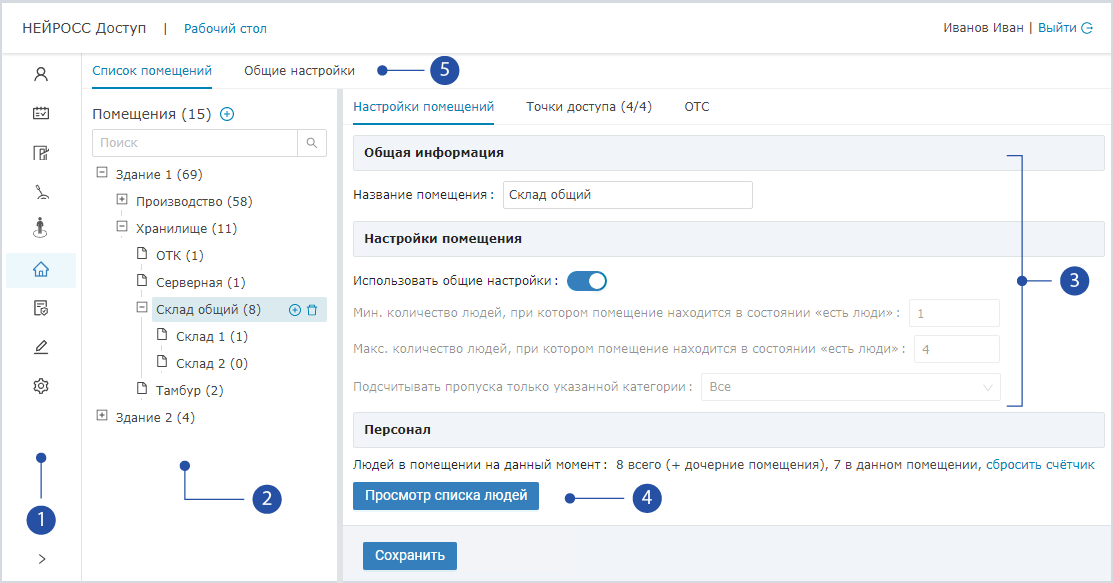 - В окне настроек помещения в блоке Персонал [4] указано количество людей с учётом вложенных помещений (всего), а также число людей конкретно в данном помещении.