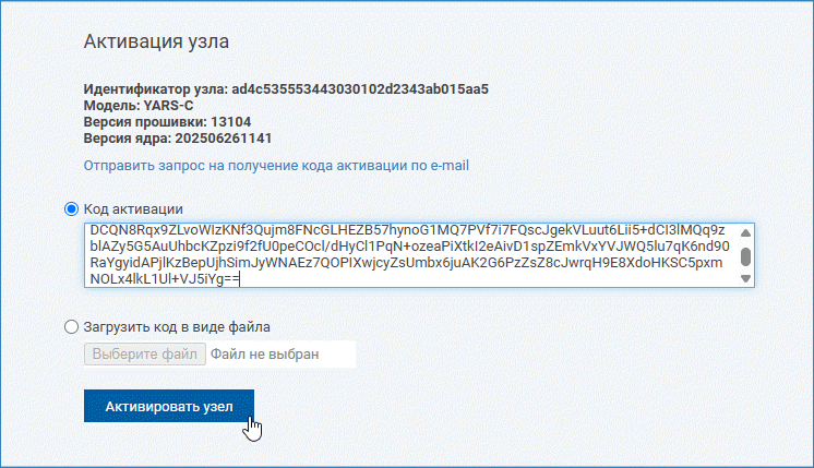 Вам также может быть предоставлен текстовый файл (в формате TXT), содержащий код активации. В этом случае выберите Загрузить код в виде файла, укажите путь к файлу и нажмите на кнопку Активировать узел.