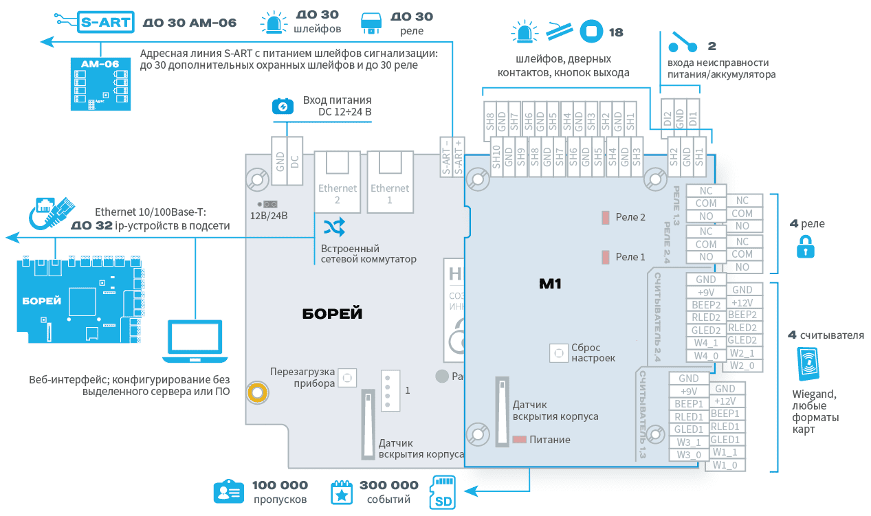 «Классический» контроллер БОРЕЙ на новой аппаратной архитектуре, обеспечивает подключение двух односторонних или одной двусторонней точки доступа. За счёт использования шины SART БОРЕЙ позволяет контролировать до 38 шлейфов сигнализации с контролем неисправности и до 32 реле. В комплекте БОРЕЙ Modbus за счёт коммуникационного модуля МК-RS485М обеспечивает возможность интеграции смежных систем по протоколу Modbus. В комплекте БОРЕЙ RS-485 Риэлта за счёт коммуникационного модуля МК-RS485Р обеспечивает возможность работы по протоколу «Риэлта-Контакт-АДР».