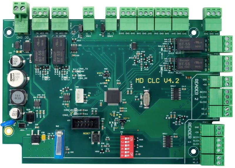 На плате М1 расположены винтовые колодки для подключения шлейфов сигнализации, замков, считывателей и реле. В качестве датчика вскрытия корпуса (тампера) используется кольцевой выключатель с подпружиненным плунжером.