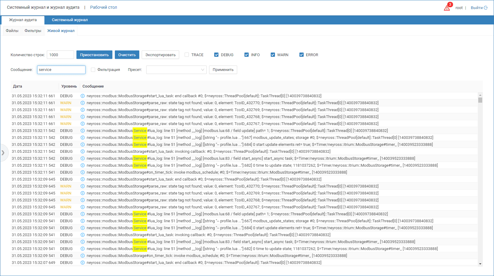 Журнал аудита предназначен для отладки пользовательских скриптов и плагинов, а также встроенных приложений Платформы НЕЙРОСС.