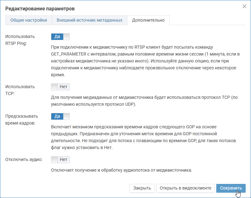 | Отключить аудио | Принудительное отключение звука у медиаисточника. Установите значение в Да, если требуется отключить звук, а в настройках самого медиаисточника такой функционал не предусмотрен. При этом аудипоток будет игнорироваться. Проигрывание «живого» видео и запись архива будет осуществляться без звука. |
