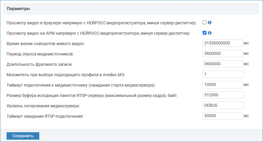 | Таймаут подключения к медиаисточнику (ожидания старта медиасервера), мс | Натуральное число | По умолчанию таймаут — 10 секунд. Значение подобрано оптимально, однако если видео «рваное», наблюдаются скачки, увеличьте таймаут подключения, сохраните изменения и перезапустите Платформу НЕЙРОСС. |