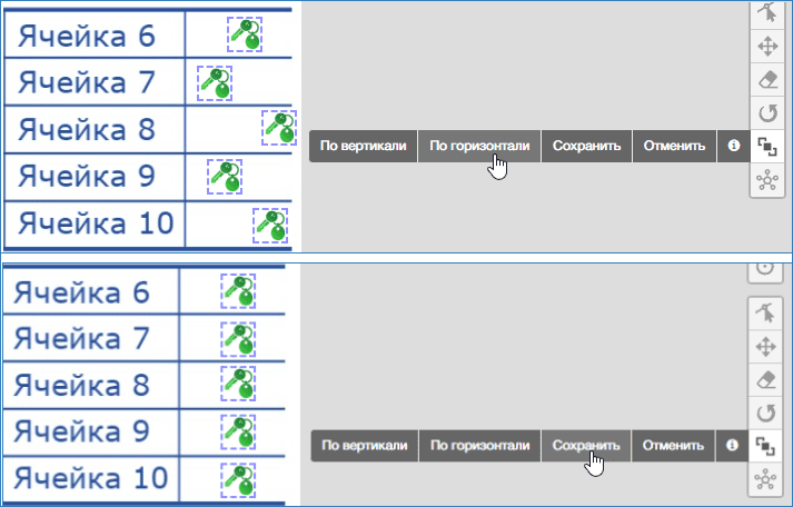 Выровнять элементы | Позволяет выровнять иконки элементов по горизонтали (в столбец), по вертикали (в строку). Выравнивание геометрических фигур не предусмотрено. Для выравнивания нескольких элементов, размещённых в виде иконки, предварительно выделите их с нажатой клавишей CTRL и нажмите По горизонтали или По вертикали. Выравнивание будет производится по первому выделенному элементу. Сохраните изменения. | |
