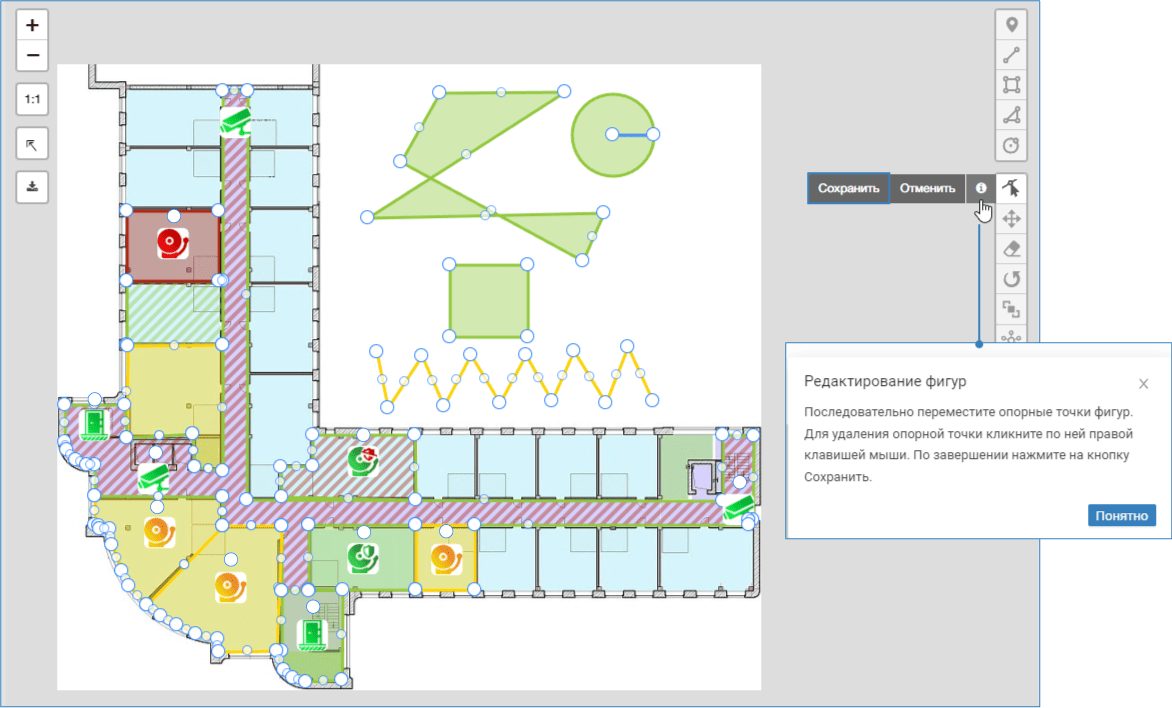 Редактировать элементы | Позволяет путем перемещения вершин отредактировать размер и положение геометрических фигур: прямых, многоугольников, кругов. Редактирование производится путём перемещения опорной точки — вершины фигуры. Последовательно переместите опорные точки фигур. Для добавления опорной точки кликните по центру любого отрезка (выделяется меньшим по размеру кружком). Для удаления опорной точки кликните по ней правой клавишей мыши. Сохраните изменения. | |
