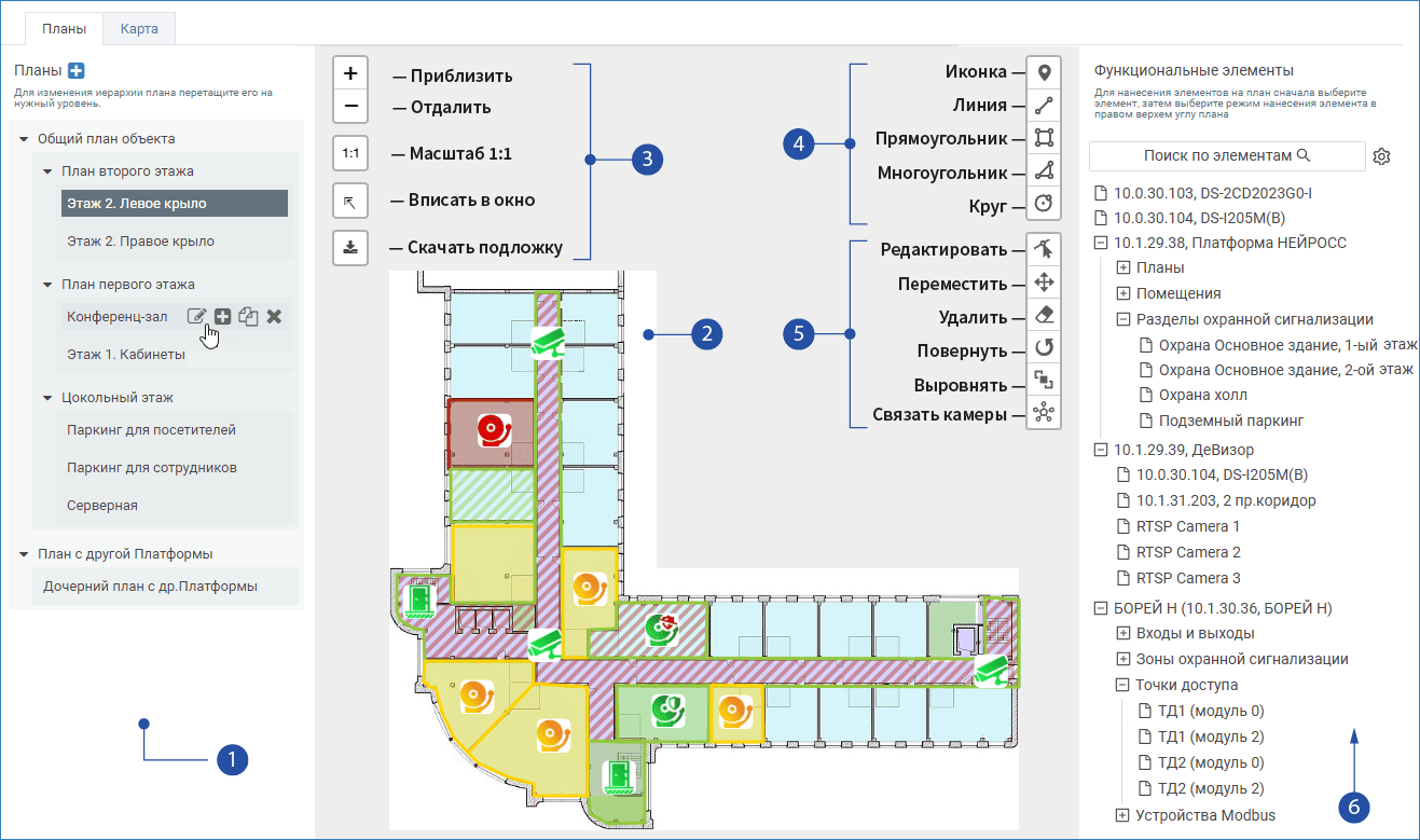 Выделите в дереве планов [1] созданный план. В окне плана [2] будет выведено изображение плана. Скроллинг в области изображения плана позволяет увеличивать/уменьшать масштаб отображения плана. Вы также можете использовать кнопки управления масштабом, расположенные в верхней части плана.