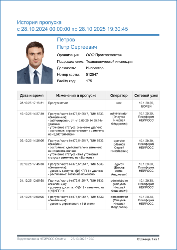 События действий над одним конкретным пропуском (выдача, изменение данных пропуска), факты изменения состояния пропуска. При необходимости просмотра всех действий над пропусками используйте шаблон История изменения пропусков.