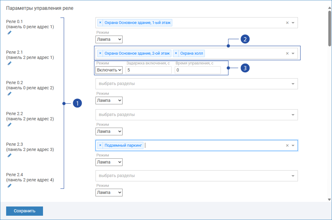 По состоянию любого раздела сигнализации возможно управление любым количеством реле в разных режимах, поэтому в раскрывающемся списке выводятся все разделы НЕЙРОСС.