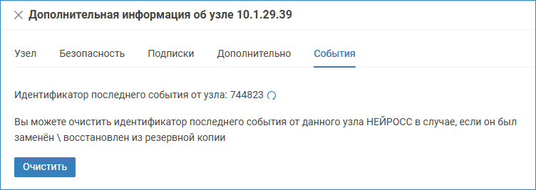 Изменения влияют только на узел, на котором выполнена очистка информации об идентификаторе последнего события. Необходимо повторить эту процедуру на всех других узлах НЕЙРОСС, которые взаимодействуют с восстановленным из резервной копии узлом. При отсутствии вкладки События в окне информации об узле в разделе Сеть, обратитесь в компанию ИТРИУМ за получением новой версии прошивки узла.