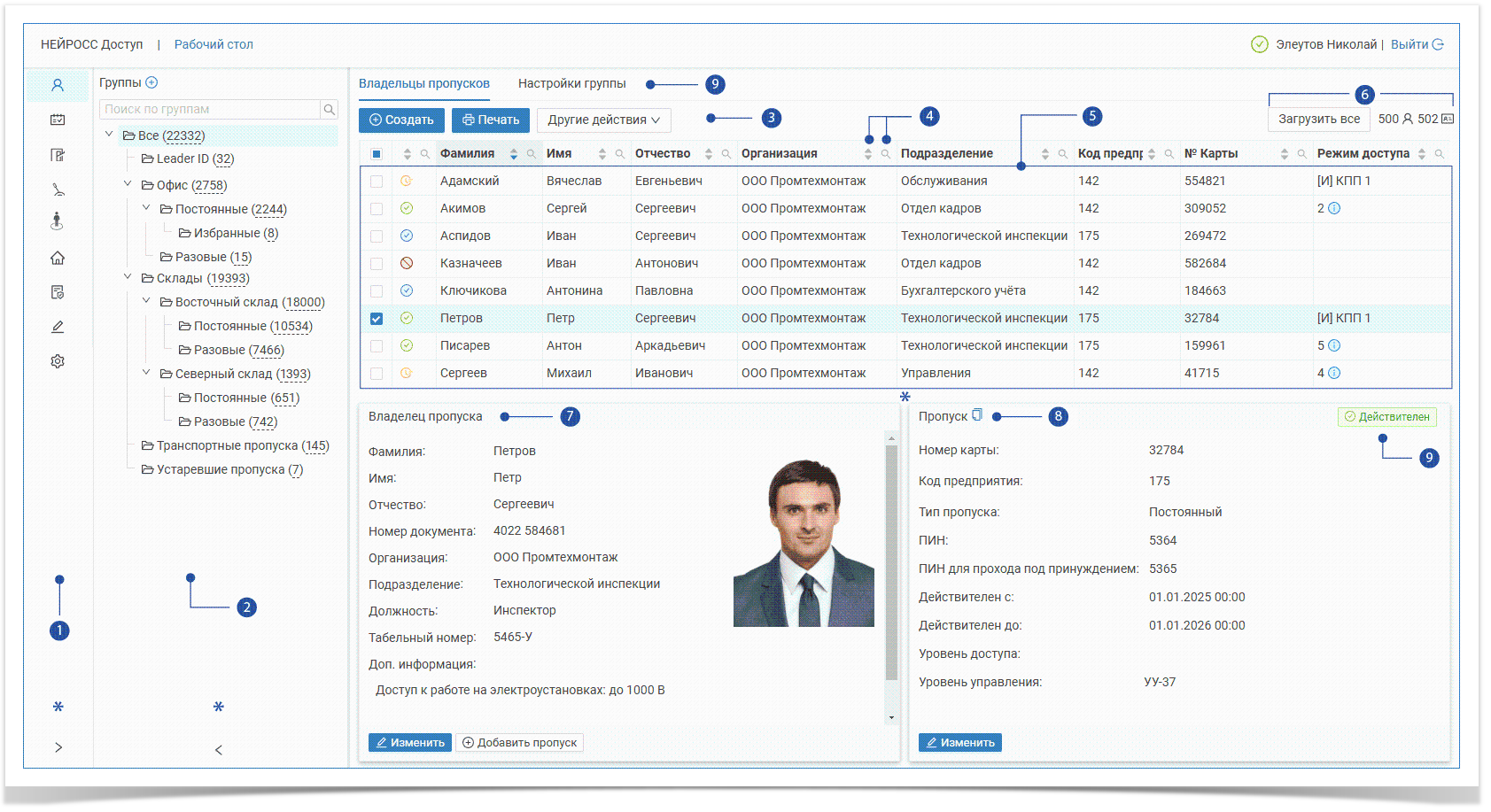 Для отображения всех владельцев и пропусков в группе и дочерних группах, нажмите на кнопку Загрузить все [6].