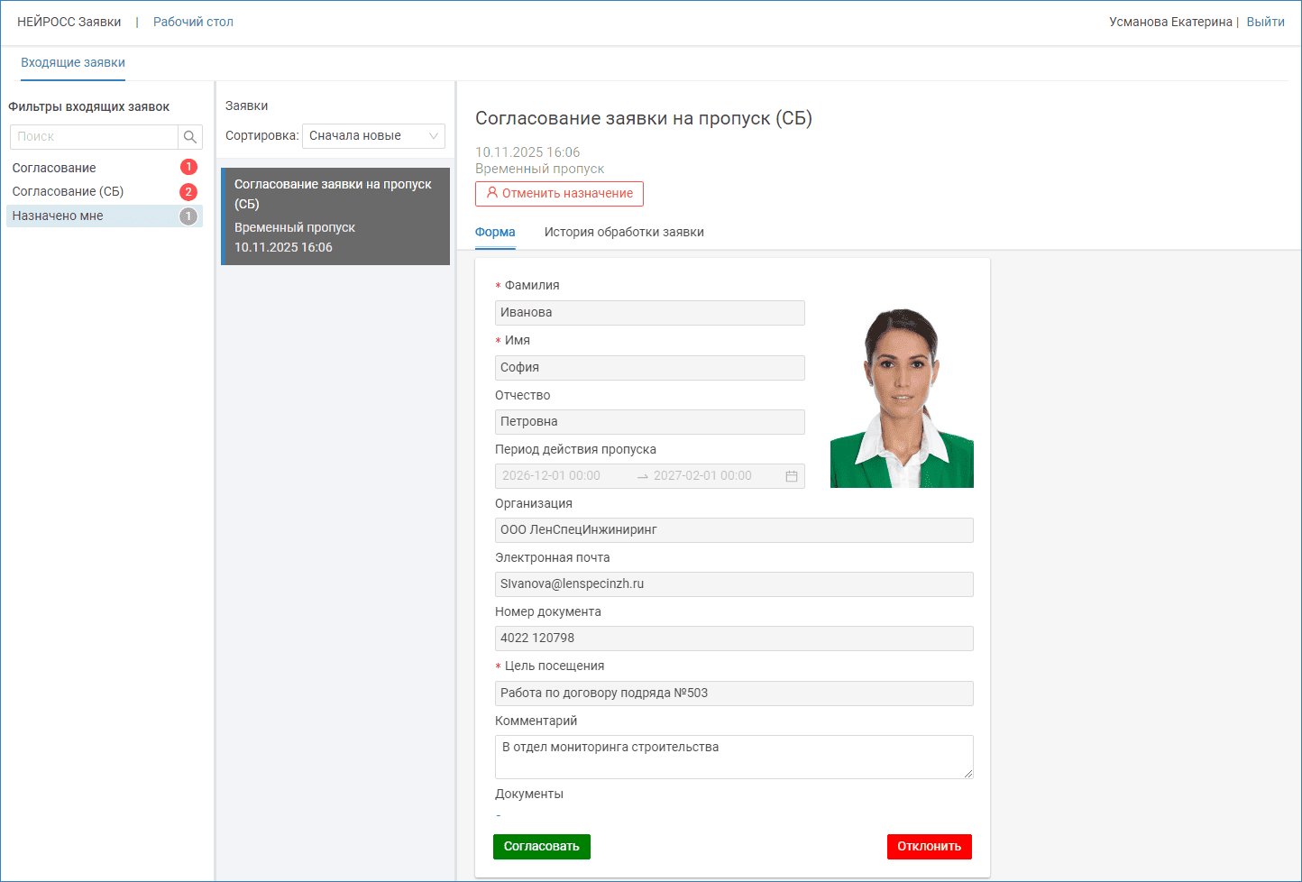 Внимательно ознакомьтесь с данными заявки [3], при необходимости, — допишите комментарий. Нажмите на кнопку Согласовать или Отклонить, в зависимости от принятого решения.